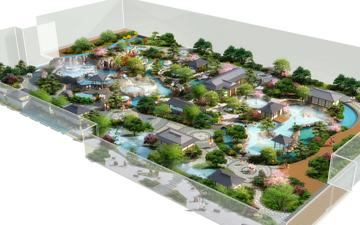 室内温泉建筑面积5000m²,规划“中国帝王温泉”、“日式温泉”、“巴厘岛式温泉”等主题室内温泉池;室外温泉区拥有8000m²的中庭园林景观,规划20组功能池,分为四季养生区、美体塑身区、百香花果区、茶艺休闲区、鱼疗欢乐区。